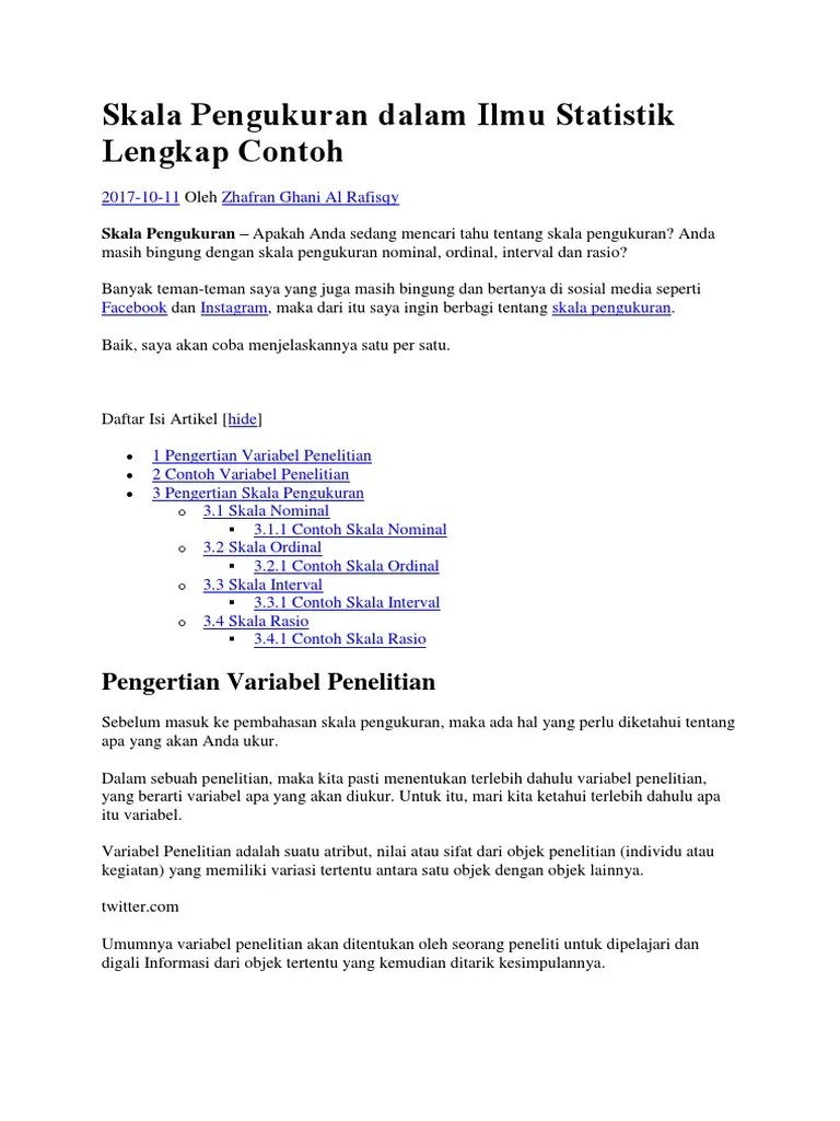 Pada proses kuantifikasi, data maupun variabel dapat diklasifikasikan dalam empat jenis skala pengukuran yakni nominal, ordinal, interval, . Ordinal, data interval, dan data rasio. Anda masih bingung dengan skala pengukuran nominal, ordinal, interval dan rasio? Dan c adalah 1, jika dilihat menggunakan skala rasio berat badan bayi a tiga kalilipat dari . Data nominal, ordinal, interval, dan rasio. Data nominal, ordinal, interval, dan rasio? Skala pengukuran interval dan rasio; Skala pengukuran nominal dan ordinal; Ø dalam banyak kegiatan penelitian, data skor yang diperoleh melalui kuesioner (misalnya skala sikap. Data nominal yang juga dikenal sebagai skala nominal adalah jenis data yang digunakan untuk . Skala (statistik) · 1 skala nominal · 2 skala ordinal · 3 skala interval · 4 skala rasio · 5 kelebihan dan kekurangan · 6 referensi . Data berdasarkan skalanya dapat dibedakan menjadi data nominal, data ordinal, data interval, dan data rasio. Skala pengukuran yang digunakan dalam dalam skala statistika yakni nominal, ordinal interval dan rasio.